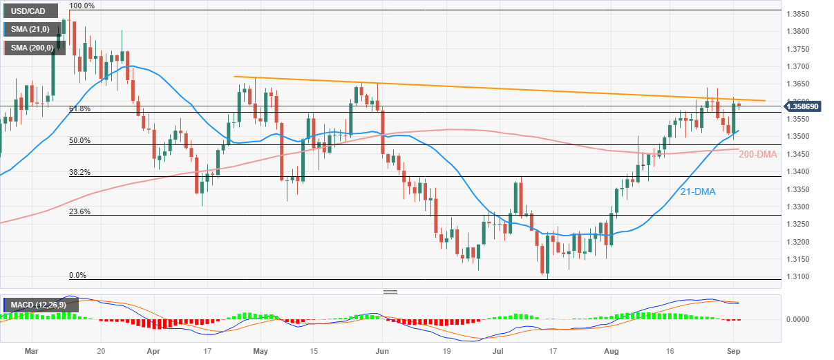 Technically, the bearish MACD signals join the USD/CAD pair’s U-turn from a downward-sloping resistance line from late April, around 1.3610 at the latest, keeping the Loonie pair sellers hopeful.
