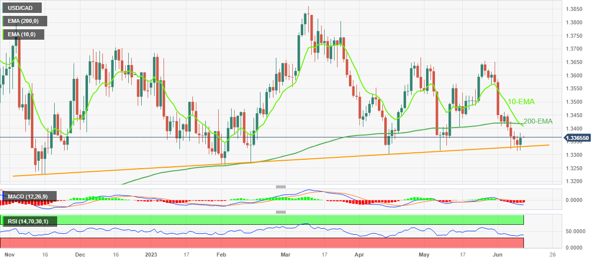 That said, the below 50.0 levels of the RSI (14) line joins an upward-sloping support line from mid-November 2022 to restrict the short-term downside of the USD/CAD pair around 1.3330.