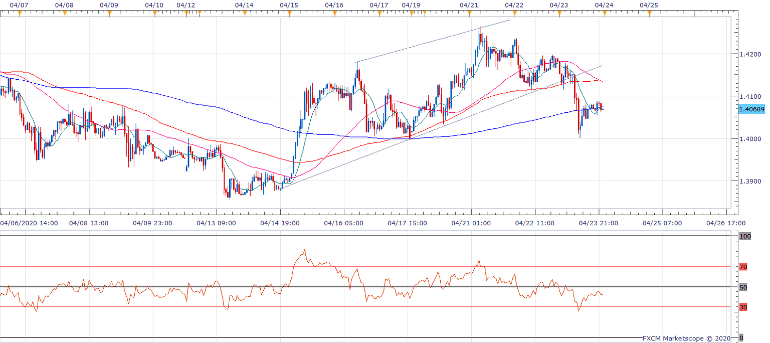 Acceptance under the 200-hour average would mean the bounce from Thursday's low of 1.40 has ended and the sell-off suggested by the 4-hour chart rising channel breakdown has resumed.