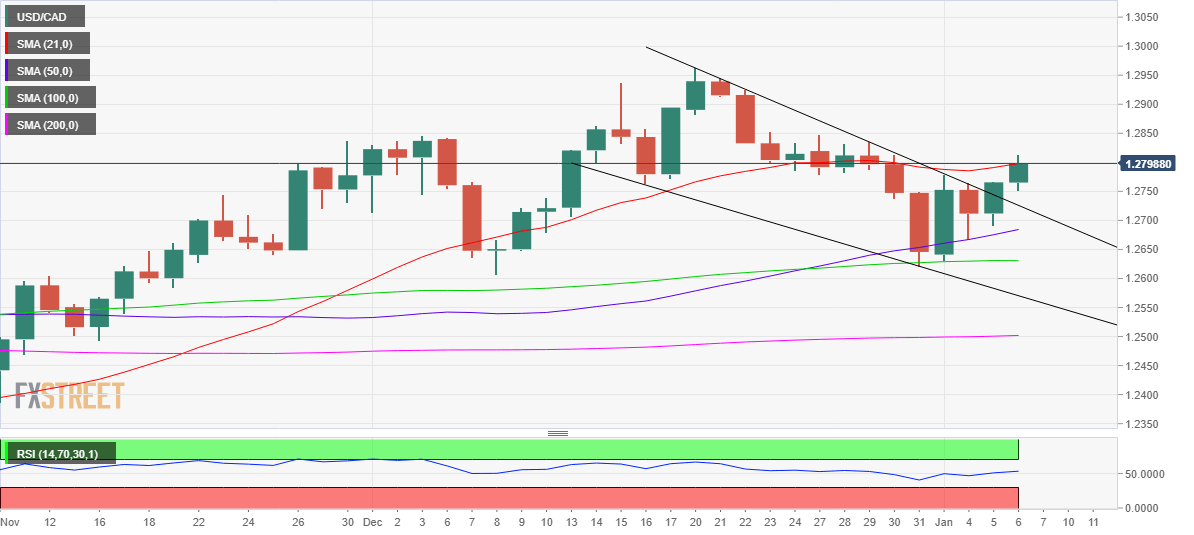 Looking at the daily chart, USD/CAD has confirmed a falling wedge breakout on Wednesday after closing the day above the falling trendline resistance at 1.2743. The extension of the bullish breakout saw the pair recapturing the critical 21-Daily Moving Average (DMA) at 1.2798.