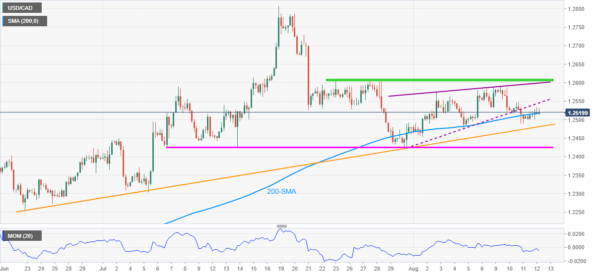 USD/CAD refreshes intraday low to 1.2519, down 0.05% on a day, amid Friday’s Asian session. Even so, the Loonie pair seesaws around 200-SMA while raising doubts on the rising wedge confirmation, portrayed on Thursday.