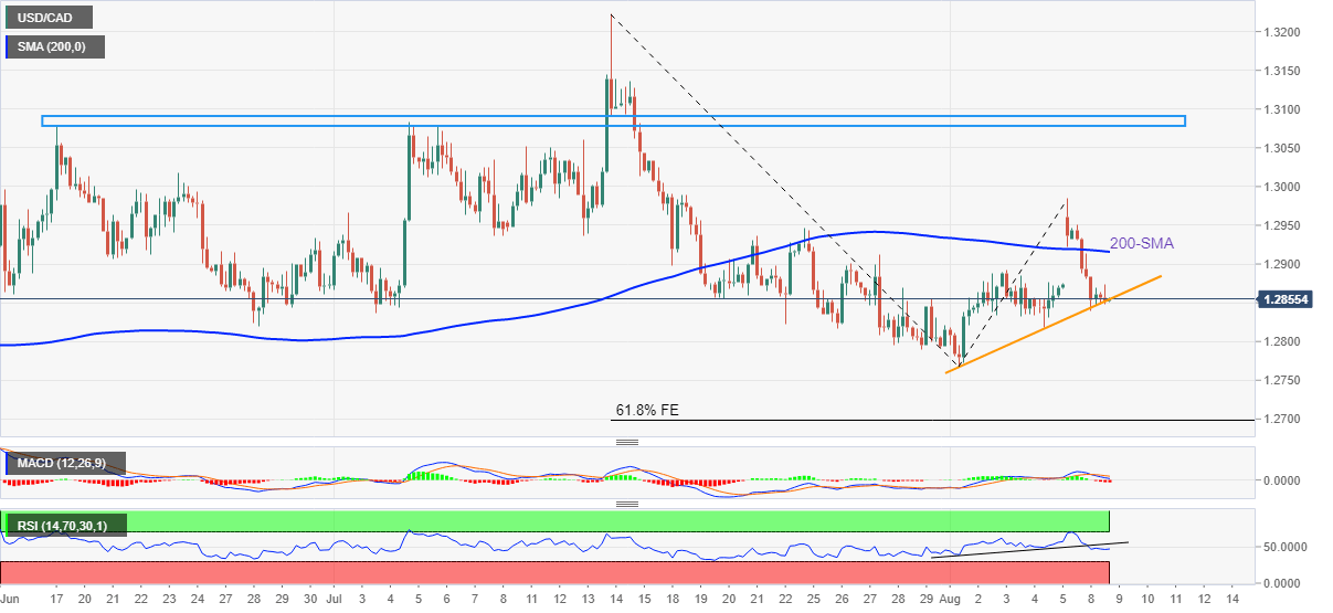 USD/CAD holds lower grounds near the intraday bottom, poking a one-week-old support line around 1.2850 during early Tuesday morning in Europe.