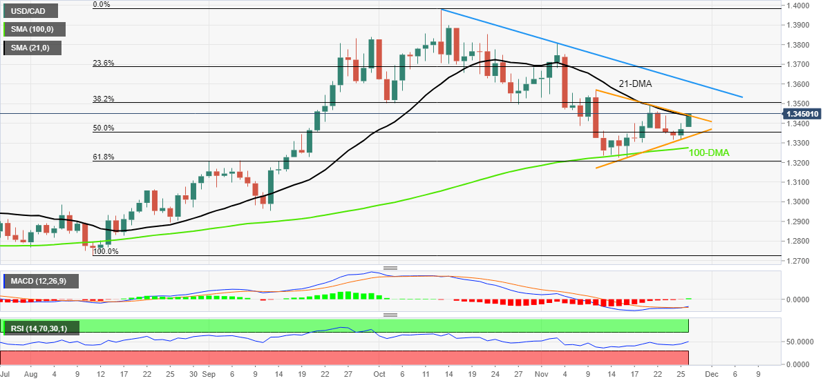 In doing so, the Loonie pair buyers attack a convergence of the 21-Day Moving Average (DMA) and a downward-sloping from November 10, around 1.3440 by the press time.