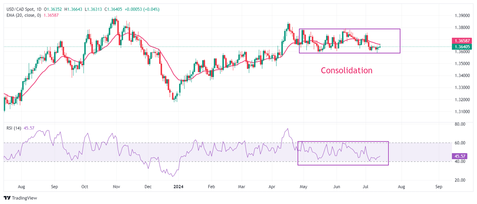 The USD/CAD pair faces severe selling pressure in an attempt to extend recovery above 1.3660 and turns negative in Monday’s European session. The Loonie asset weakens as the US Dollar (USD) surrenders its gains, which were driven by improved speculation that Donald Trump will win the United States (US) Presidential elections later this year.