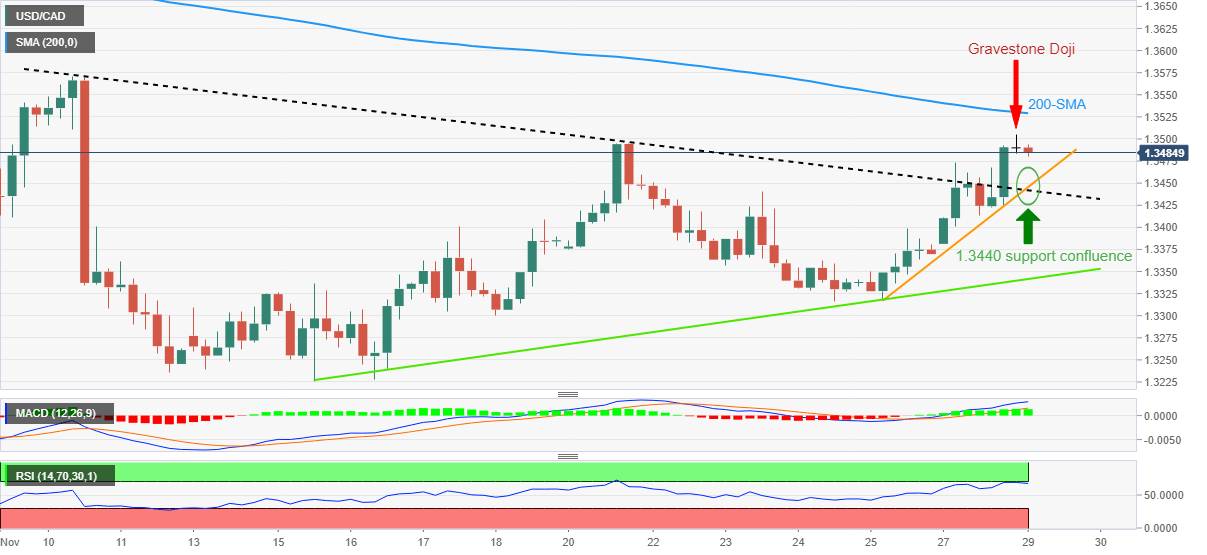 USD/CAD Price Analysis: Gravestone Doji, overbought RSI highlights 1.3440 support confluence