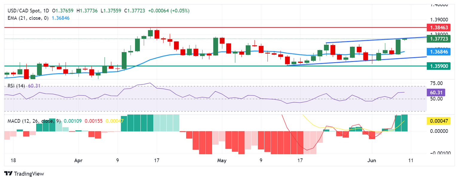 - USD/CAD could test the upper boundary of the rising channel around the level of 1.3775.