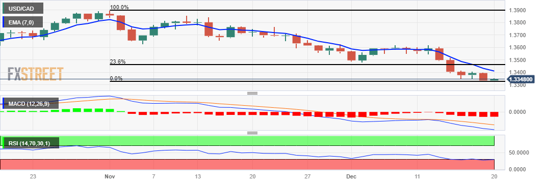 USD/CAD Price Analysis: Hovers below 1.3350 followed by the seven day EMA