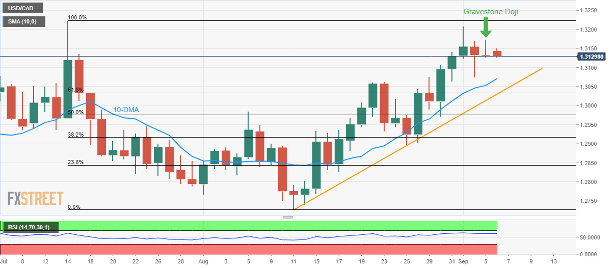 USD/CAD Price Analysis: Justifies Monday’s Gravestone Doji to drop towards 1.3100