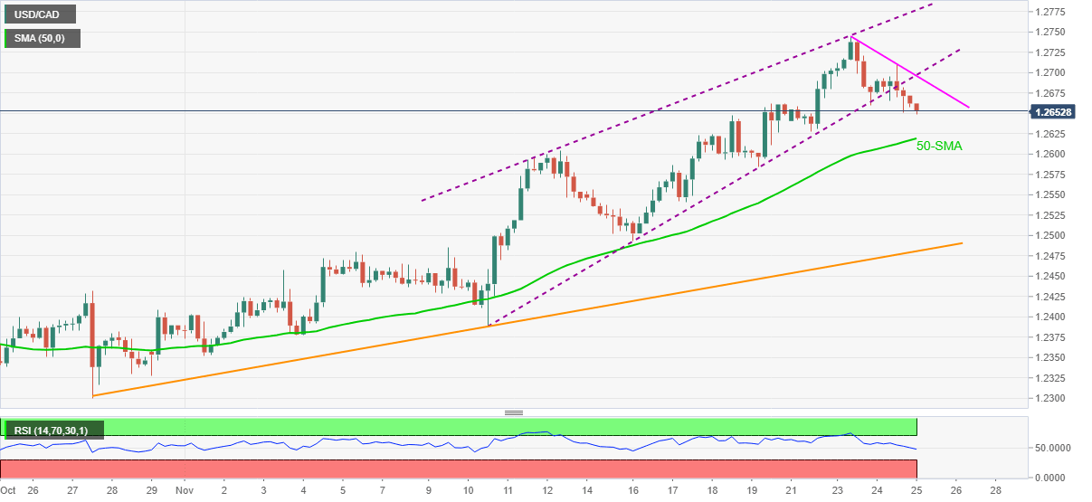 That said, the quote currently drops towards 50-SMA around 1.2620 but the early November highs near 1.2600 will challenge the USD/CAD bears afterward.