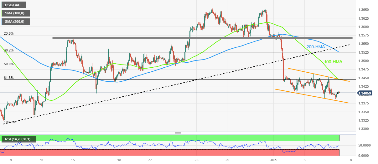 That said, the steady RSI (14) line allows the USD/CAD pair to grind higher within a one-week-old bearish trend channel, currently between 1.3380 and 1.3445-50.