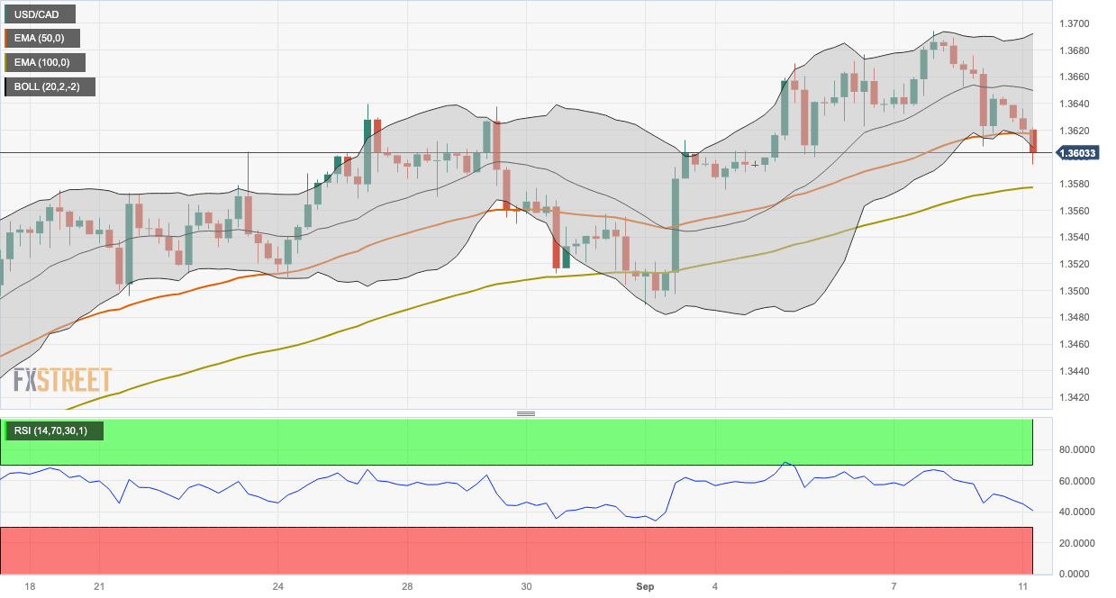 - USD/CAD is trading near the 1.3600 mark, above the key 100-hour EMA.