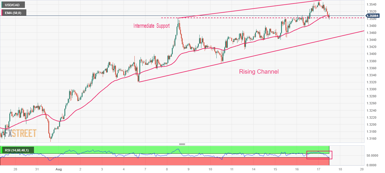 USD/CAD trades in a Rising Channel chart pattern on an hourly scale in which each pullback is considered as buying opportunities by the market participants. The Loonie asset has corrected to near the immediate support plotted from August 8 high around 1.3500. Also, the upward-sloping 50-period Exponential Moving Average (EMA) at 1.3505 is providing support to the US Dollar bulls.