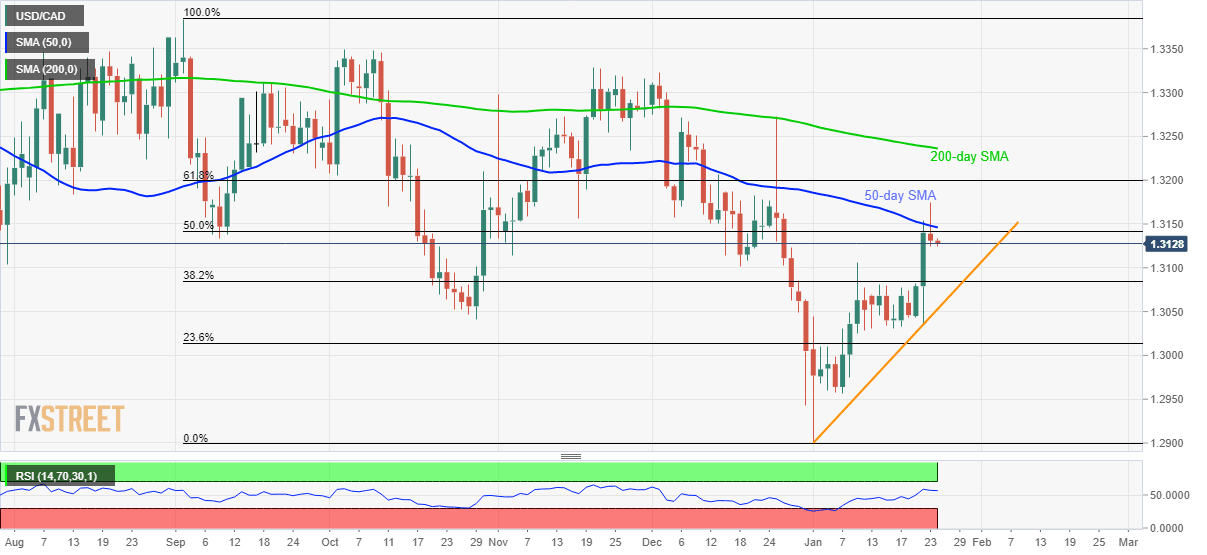 Following its pullback from the monthly top, USD/CAD drops to sub-1.3130 area during the pre-Europe session on Friday. The pair recently failed to cross 50-day SMA, not to forget 50% Fibonacci retracement level of September 2019 to January 2020 fall.