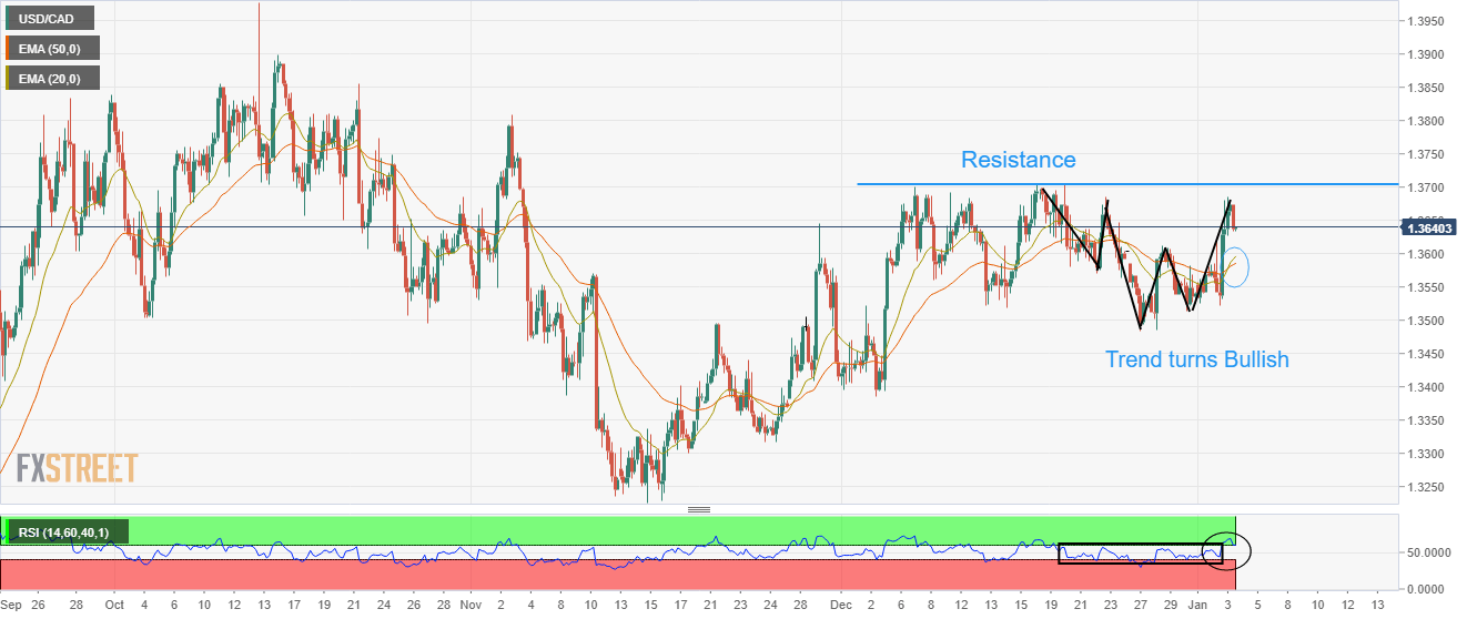 Investors should note that the trend has turned bullish on a four-hour scale after remaining topsy-turvy for a long period. The Loonie asset is likely to face barricades around the horizontal resistance plotted near the round-level hurdle of 1.3700.