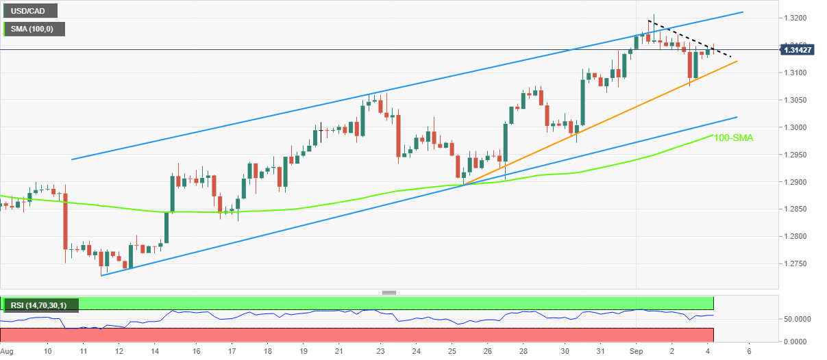 In addition to the upside break of the short-term resistance line near 1.3150, the USD/CAD bulls also cheer firmer RSI (14), not overbought, to aim for the monthly high near 1.3210.