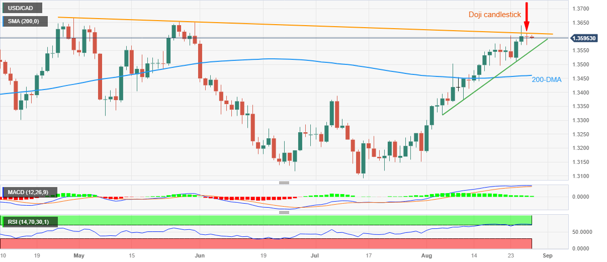 USD/CAD remains on the back foot around 1.3600 after reversing from a three-month high the last week, not to forget the previous day’s U-turn from an important resistance line. That said, the Loonie pair teases bears around the intraday low of 1.3590 during early Tuesday morning in Europe.