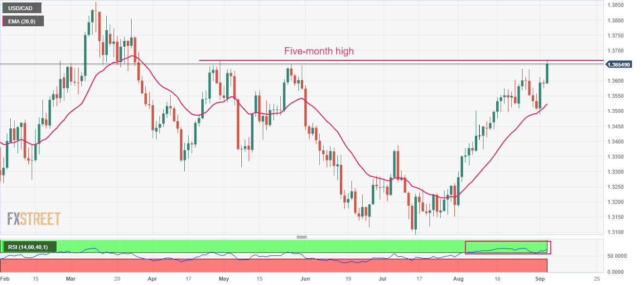 USD/CAD extends its rally and prints a fresh five-month high at 1.3670. The pair recovered sharply after sensing decent buying interest near the 20-day Exponential Moving Average (EMA) around 1.3520. The Relative Strength Index (RSI) (14) trades in the bullish range of 60.00-80.00, and is not showing signs of oversold and divergence.