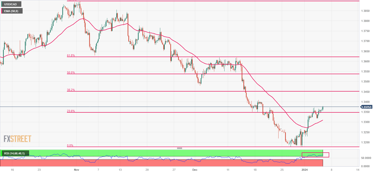 USD/CAD has climbed above the 23.6% Fibonacci retracement (plotted from 1 November 2023 high at 1.3900 to 27 December 2023 low at 1.3177) at 1.3350. Upward-sloping 50-period Exponential Moving Average (EMA), which trades around 1.3310 will continue to provide support to the US Dollar bulls.