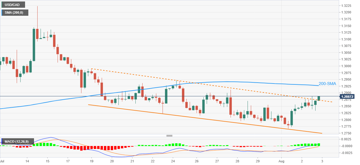 USD/CAD extends the previous upside momentum while ejecting the short-term bearish chart pattern during Wednesday’s Asian session. In doing so, the Loonie pair refreshes intraday high around 1.2890 during the three-day uptrend.