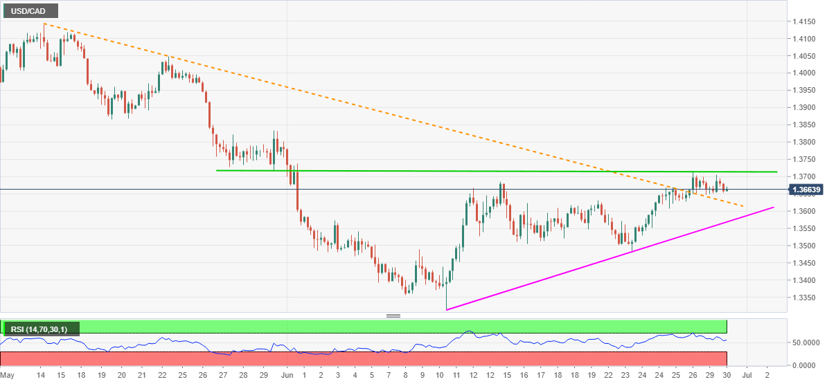 USD/CAD recedes to 1.3660 during Tuesday’s Asian session. Even so, the loonie pair stays above a short-term descending trend line, previous resistance, while also staying above the immediate support line.