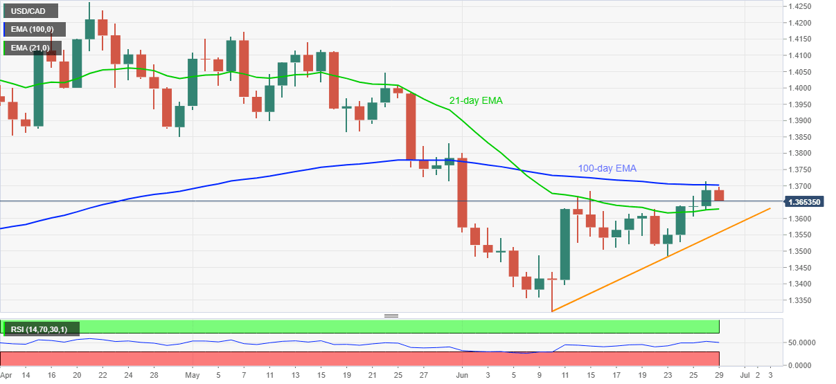 USD/CAD declines to 1.3660, down 0.20% on a day, during the Asian session on Monday. In doing so, the loonie pair justifies the early day’s U-turn from 100-day EMA. As a result, sellers may keep eyes on 21-day EMA as immediate support during the further fall.
