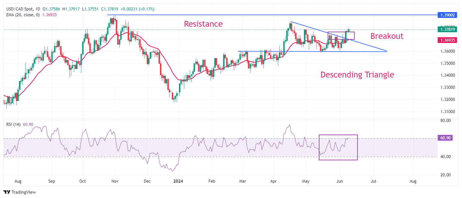 USD/CAD strengthens after a breakout of the Descending Triangle chart pattern formed on a daily timeframe. The upward-sloping 20-day Exponential Moving Average (EMA) near 1.3700 suggests that the near-term trend is bullish.