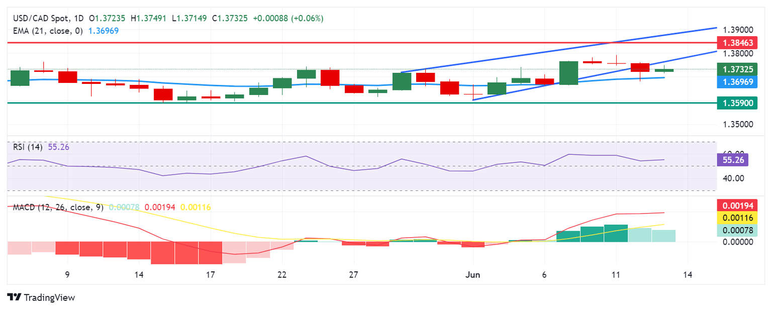 USD/CAD Price Analysis: Rises to near 1.3750 nearing lower boundary of rising channel