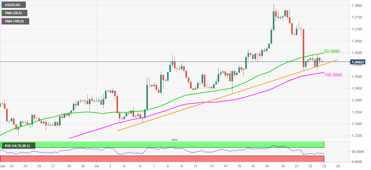 USD/CAD keeps pullback from 50-SMA around 1.2560 during a lackluster Friday morning in Asia. In doing so, the major currency pair remains between the 50-SMA and 100-SMA as bears battle an upward sloping trend line from July 06.