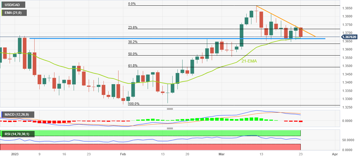 USD/CAD reverses from a two-week-old resistance line to print the first daily loss in three around 1.3675 heading into Thursday’s European session. In doing so, the Loonie pair pokes a key support confluence comprising the 21-day Exponential Moving Average (EMA) and a horizontal line stretched from early January, the previous resistance.