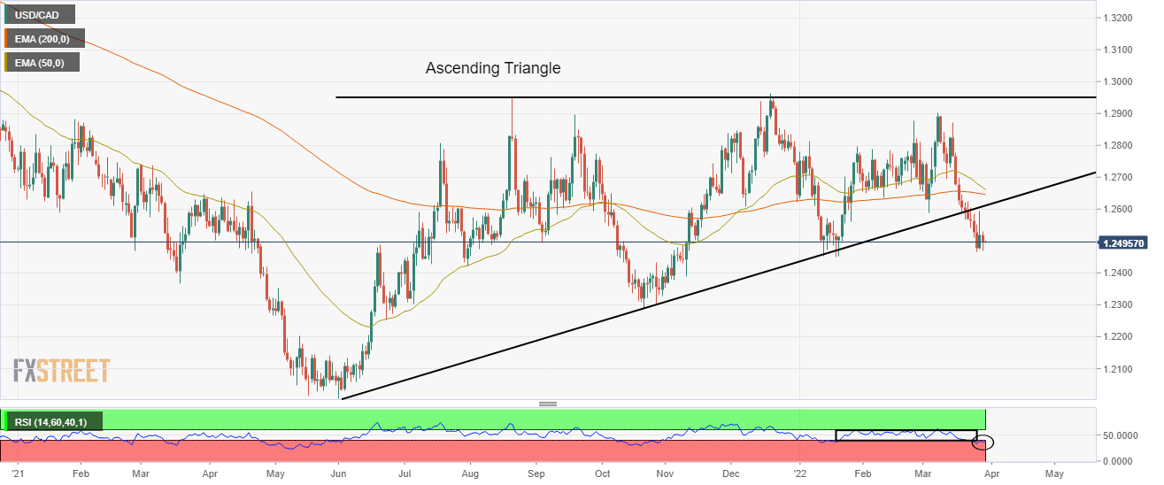 On the daily scale, the USD/CAD has settled below the ascending triangle formation whose upper end is capped around 1.2960 while the trendline of the lower end is placed from 18 May 2021 low at 1.2013. Usually, a violation of an ascending triangle formation on the downside fetches volume expansion and displays wide range ticks.