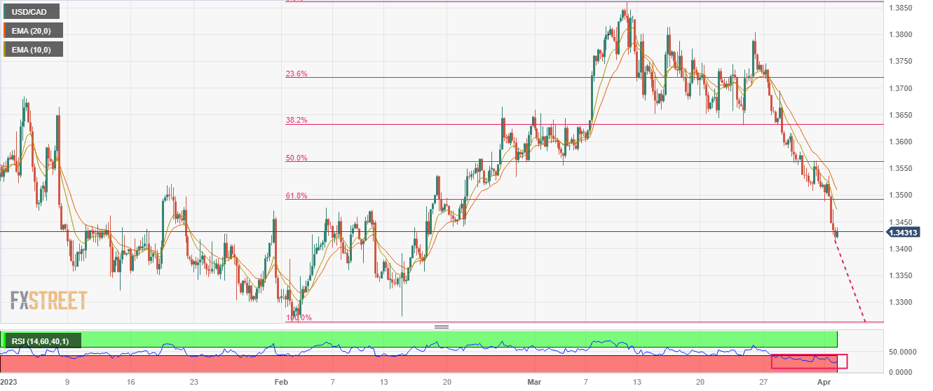 The USD/CAD pair has attempted a recovery after dropping to near 1.3410 in the early Asian session. The recovery move by the Loonie asset is expected to turn into a short-lived pullback as the US Dollar Index (DXY) would extend its downside journey on expectations of an early pause in the rate-hiking spell by the Federal Reserve (Fed).