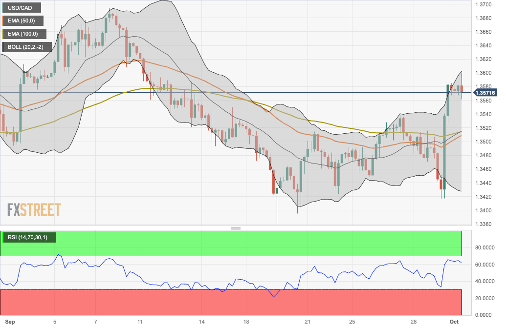 - USD/CAD retraces to 1.3570, and holds above the 50- and 100-hour EMAs on the four-hour chart.