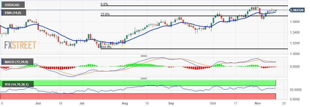 USD/CAD bids higher around 1.3820 during the early European session on Tuesday, followed by the immediate resistance region around 1.3850 lined up with the previous week’s high at 1.3854 level.