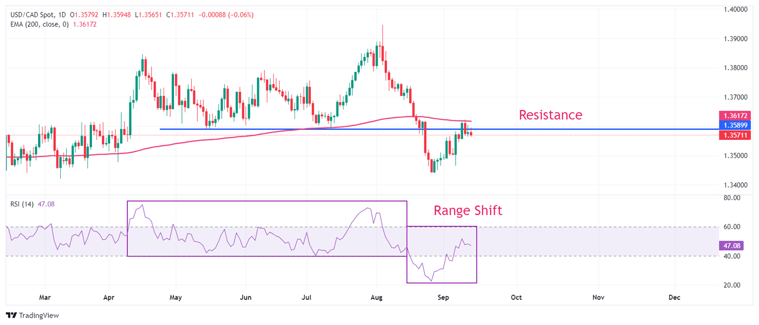 USD/CAD delivers a mean reversion to near the 200-day Exponential Moving Average (EMA), which trades around 1.3620. The near-term outlook of the pair appears to be bearish as the 14-day Relative Strength Index (RSI) has shifted into the bearish range of 20.00-60.00 from 40.00-80.00.