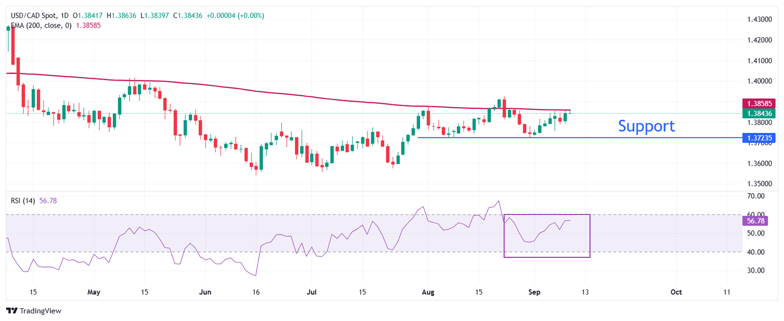 USD/CAD stays below the 200-day Exponential Moving Average (EMA), which trades around 1.3870, suggesting that the overall trend is bearish.
