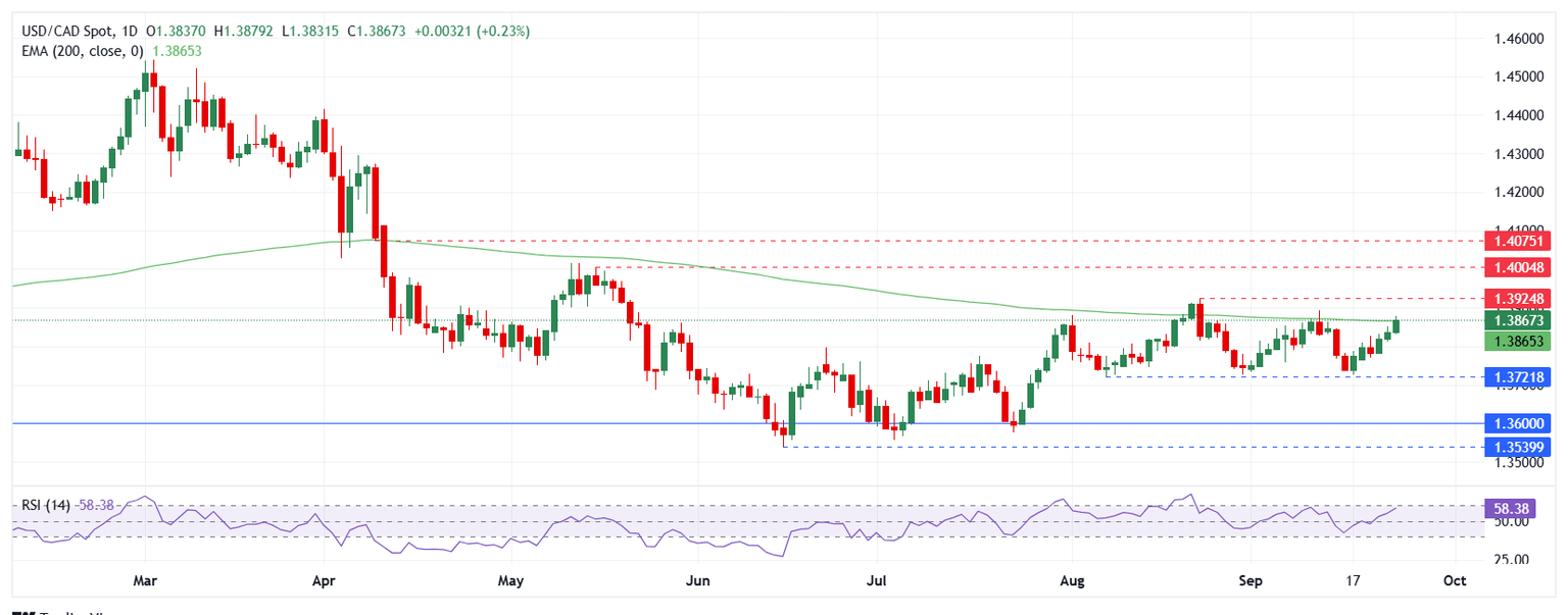 USD/CAD extends its winning streak for the third trading day on Wednesday. The pair has also extended its upside above the 200-day Exponential Moving Average (EMA), which trades around 1.3865.