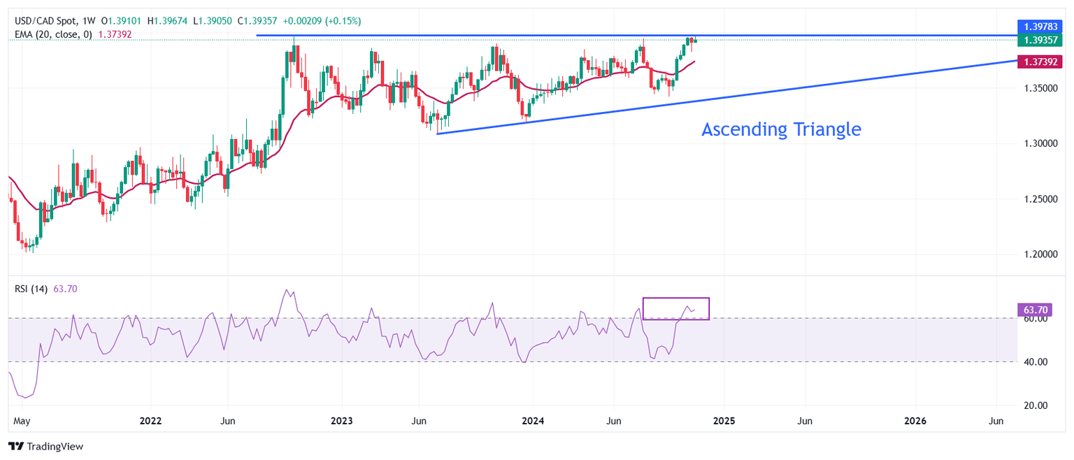 USD/CAD trades near the upper boundary of the Ascending Triangle chart pattern on a weekly timeframe around 1.3950. Upward-sloping 20-week Exponential Moving Average (EMA) around 1.3740 suggests a strong uptrend.