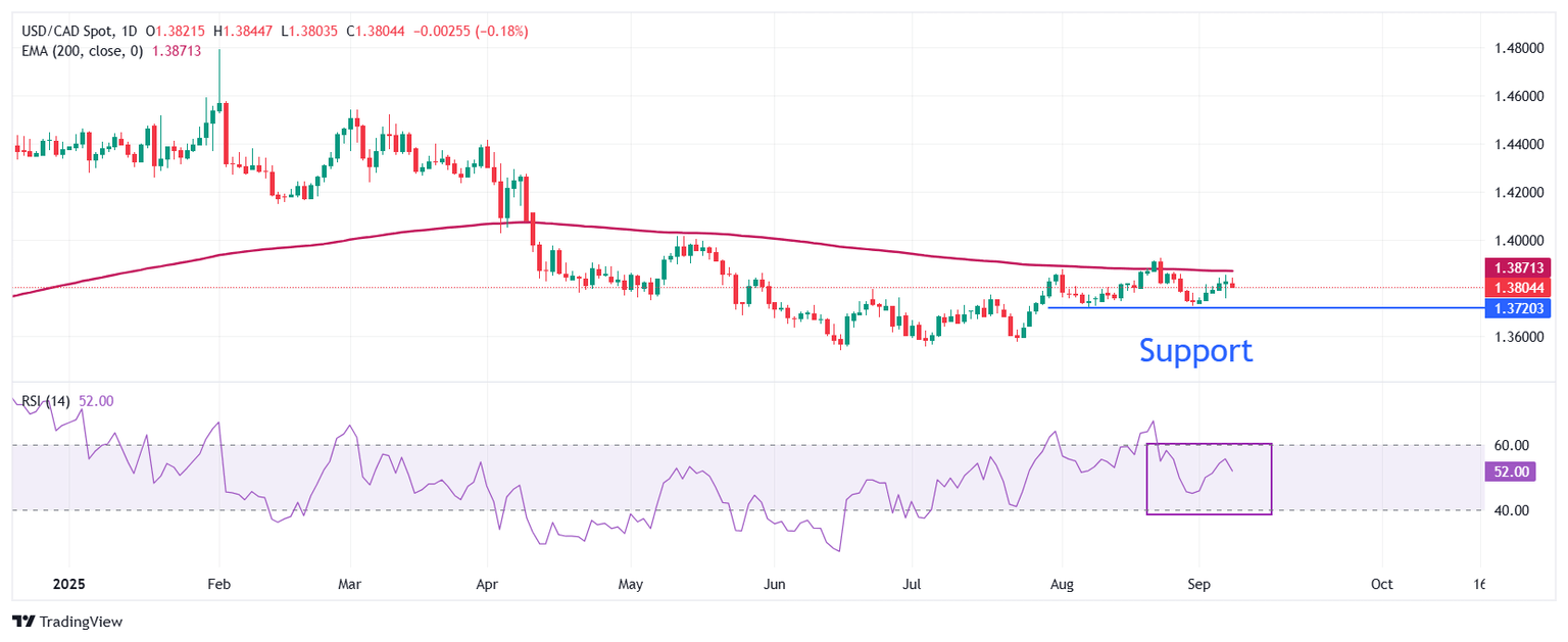 USD/CAD stays below the 200-day Exponential Moving Average (EMA), which trades around 1.3870, suggesting that the overall trend is bearish.