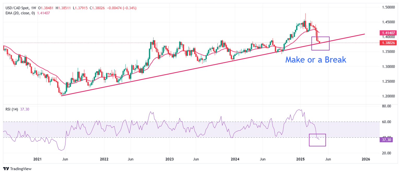 USD/CAD trades at a make-or-break level near the upward-sloping trendline around 1.3800, which is plotted from the May 2021 low of 1.2031 on a weekly timeframe.