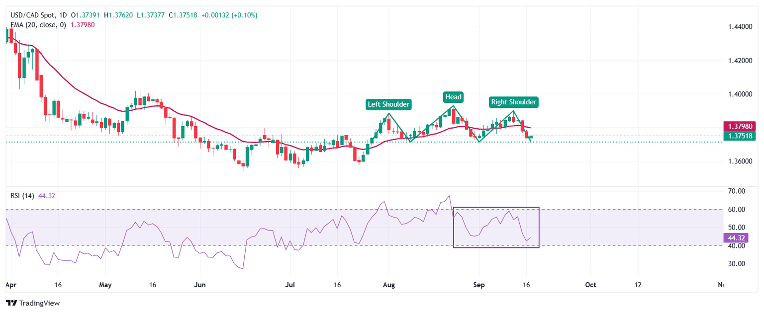 USD/CAD forms a Head and Shoulder chart pattern, which indicates a bearish reversal. The neckline of the above-mentioned chart pattern is plotted near 1.3715.