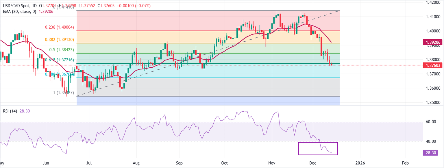 USD/CAD trades lower at 1.3760 on Friday. The pair sits below the descending 20-day Exponential Moving Average (EMA) at 1.3921, keeping the short-term bias bearish and capping rebounds.