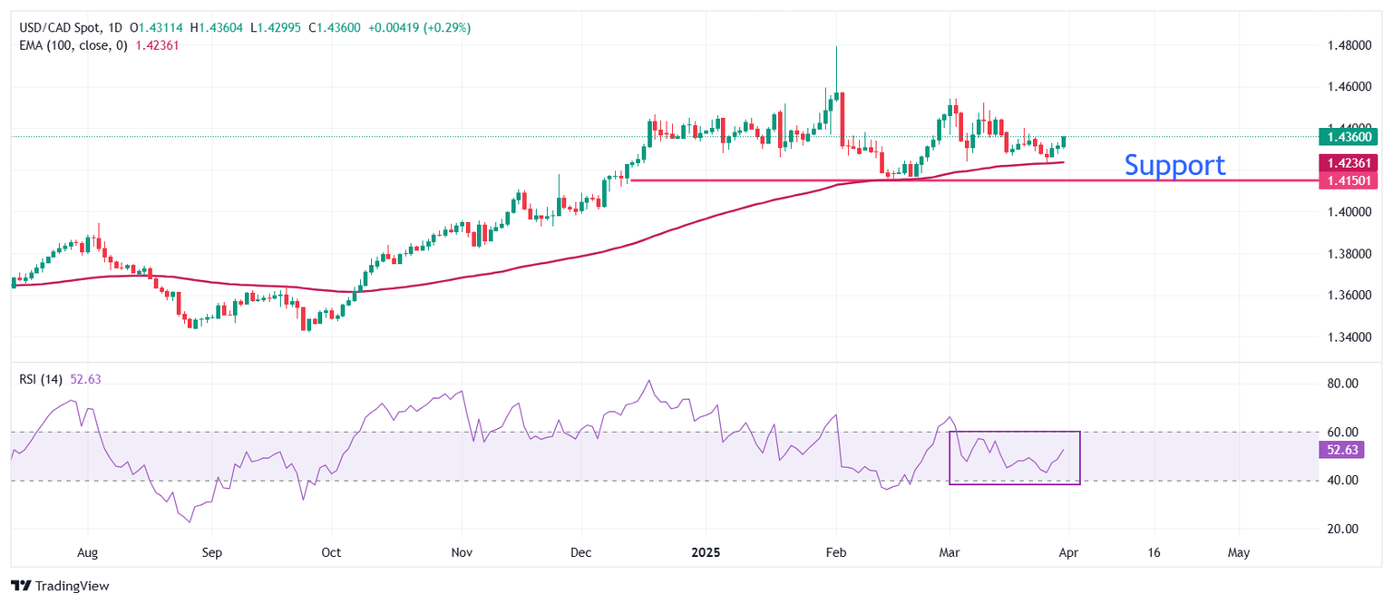 The USD/CAD pair extends its winning streak for the third day on Monday. The Loonie pair jumps to near 1.4360 as investors expect the imposition of reciprocal tariffs by United States (US) President Donald Trump on so-called Liberation Day, which is Wednesday, will have a native impact on the Canadian economic outlook.