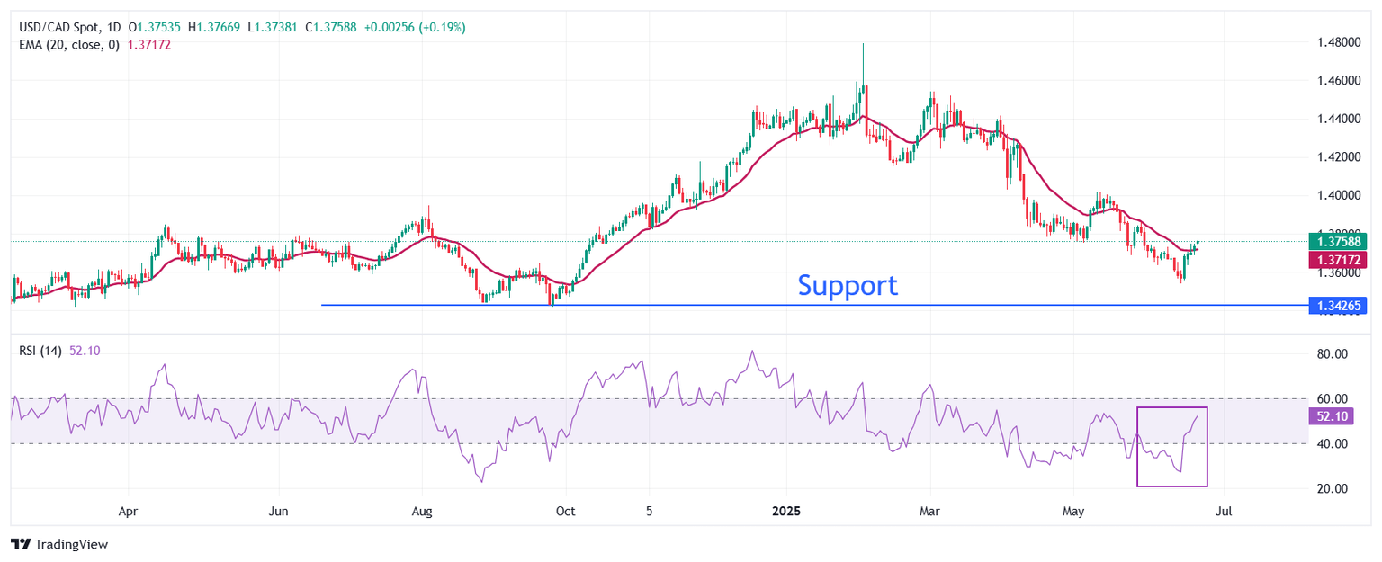 USD/CAD gains for five trading days in a row after posting a fresh eight-month low around 1.3540 on June 16. The Loonie pair recovers above the 20-day Exponential Moving Average (EMA), indicating that the near-term trend has turned bullish.
