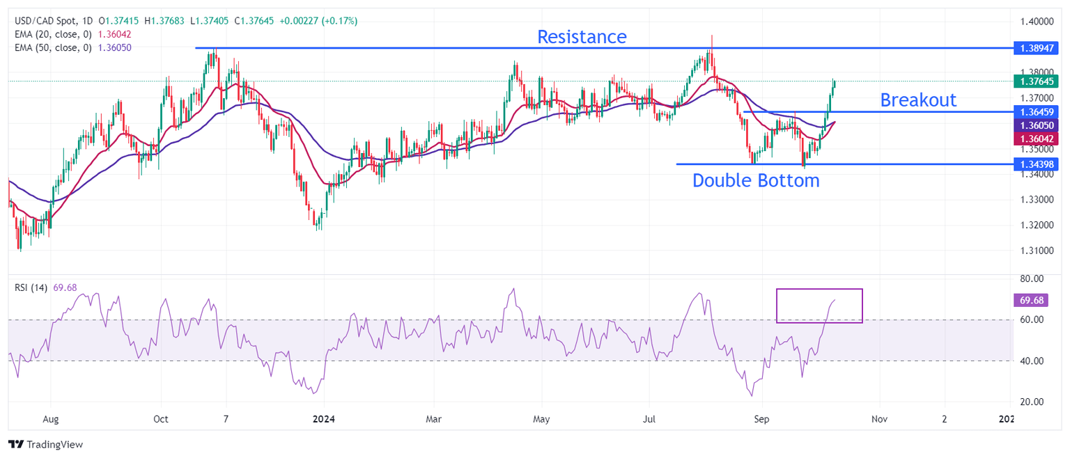 The USD/CAD pair extends its winning spell for the eighth trading day on Friday. The Loonie pair strengthens and rises above 1.3750 amid sheer weakness in the Canadian Dollar (CAD). The Canadian currency exhibits weakness amid growing expectations that the Bank of Canada (BoC) will cut interest rates further in October.