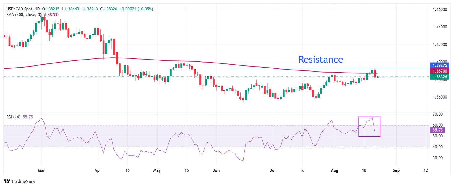USD/CAD corrects sharply after facing selling pressure above the 200-day Exponential Moving Average (EMA), which trades around 1.3870.