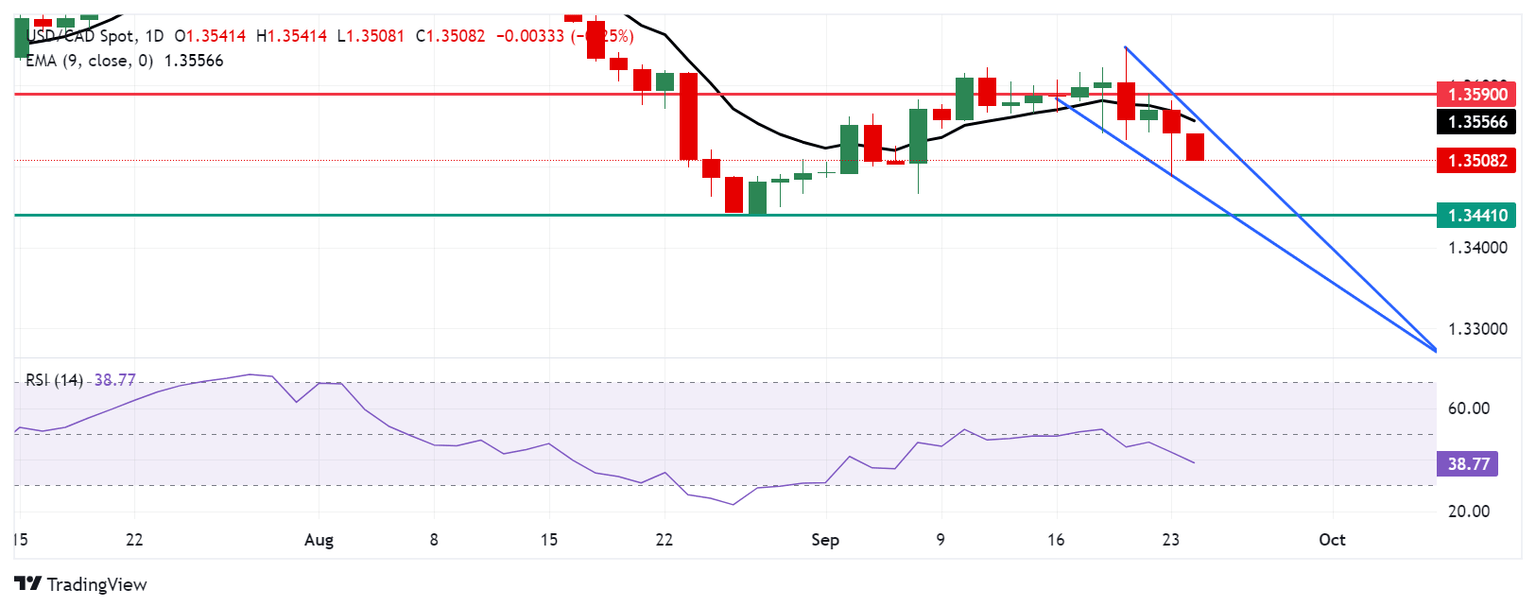 USD/CAD Price Forecast: Falls toward 1.3500; next support at lower boundary of the pattern