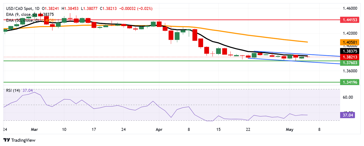 On the downside, the USD/CAD pair may retest the key psychological support at 1.3800, followed by the seven-month low of 1.3760, last seen on May 2, which sits just above the lower boundary of the descending channel around 1.3750.