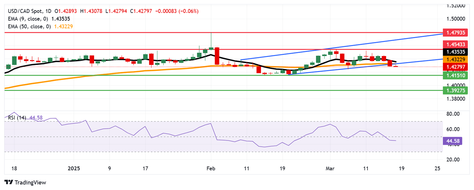 On the upside, immediate resistance is at the psychological level of 1.4300, followed by the 50-day EMA at 1.4322 and the nine-day EMA at 1.4353. A break above this resistance zone could strengthen short-term price momentum, potentially driving the USD/CAD pair toward the monthly high of 1.4543, recorded on March 4.