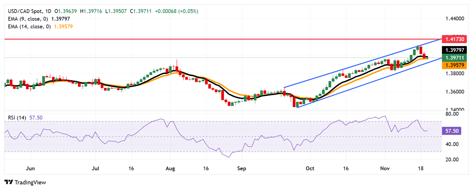 The USD/CAD pair holds ground after two days of losses, trading around 1.3970 during the European hours on Wednesday. The daily chart analysis indicates that the pair is trending upwards within an ascending channel pattern, suggesting a bullish bias.