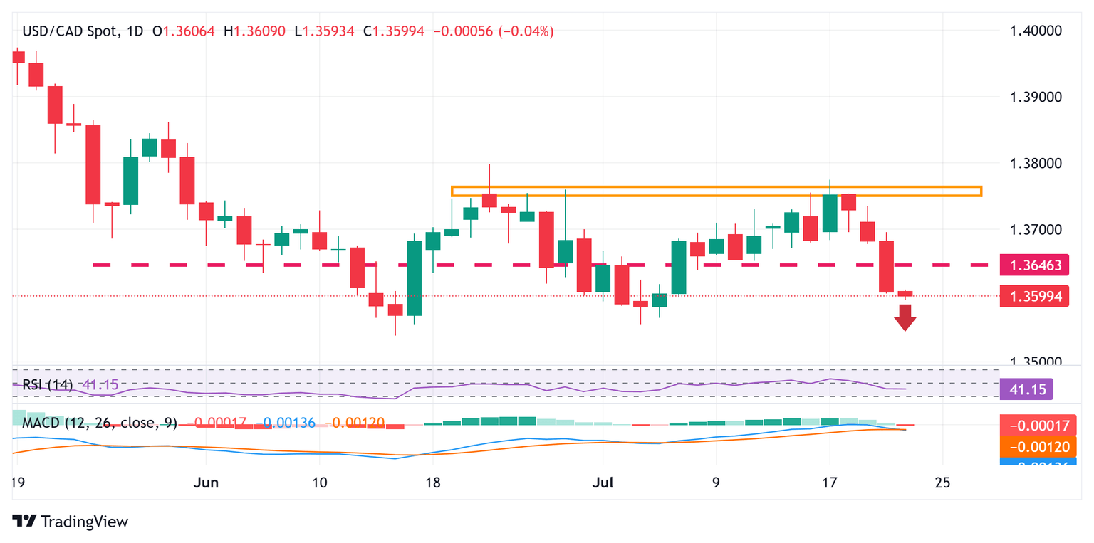 USD/CAD Price Forecast: Hangs near two-week low, seems vulnerable around 1.3600